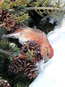 Color seems out of place in such a white-coated world, but this winter I seem to have encountered many wintering birds adorned brightly with red. They appear incongruous, like splashes of pink-blooming plum among all the whiteness. The brilliant red of the crane’s crown, the pink cheeks of a Eurasian Bullfinch, the red forehead of the Common Redpoll, the red tail tip of the Japanese Waxwing, the red chest of a Pallas’s Rosefinch, the paler pink body of the Long-tailed Rosefinch, and the all-over deep plum-red of the Common Crossbill; all seem heightened by the snow. These birds will depart northward very soon, and we will not see pink here for several more weeks — not until the mountain cherries finally send forth their blossoms.
