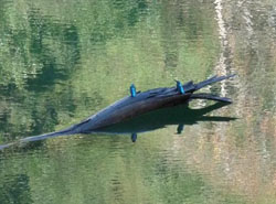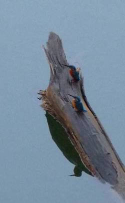 A fine pair: A male and a female Common Kingfisher use a log as their crow's-nest to watch for underwater prey.