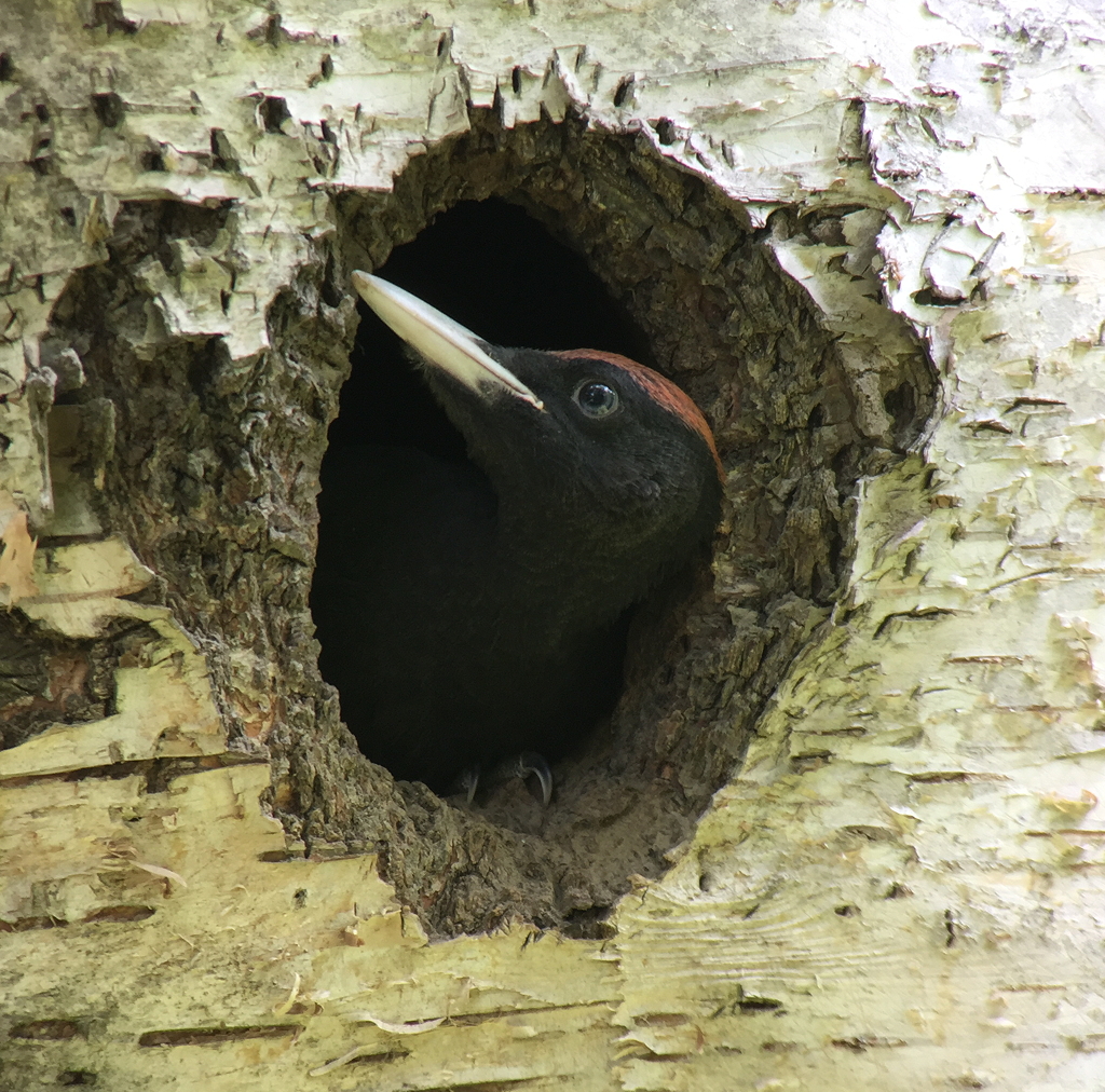 A young Black Woodpecker emerges from its nest cavity © Mark Brazil