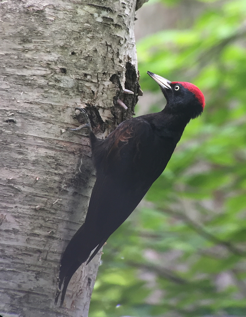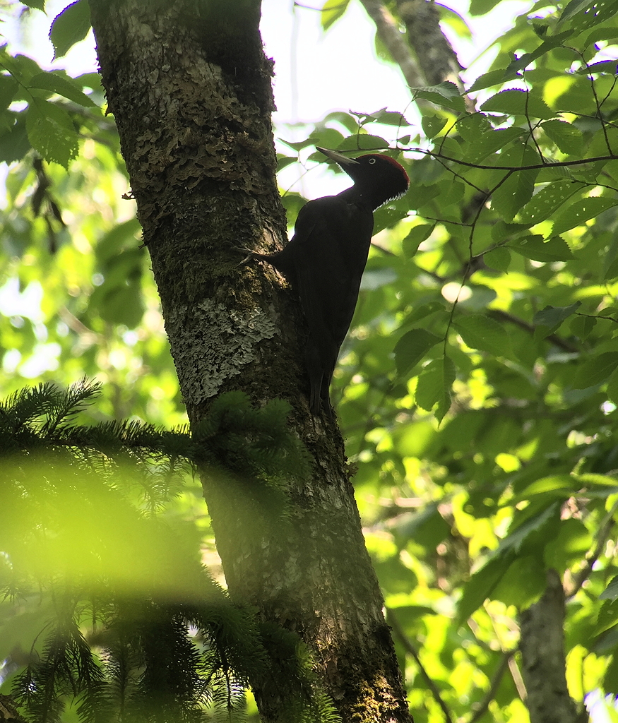 Our largest woodpecker, the Black Woodpecker, is crow-like in size and colour, it dwarfs the rest of its tribe here in Japan. Enormous and black as the midnight sky the woodpecker sits motionless, staring out through a baleful and ghostly-white eye. “Sit” seems the only way to describe this strange pose, because of the way it has braced itself, with its limbs akimbo, strong toes widespread, long grapnel-like claws gripping rough bark, resting its weight down the tree’s trunk onto it’s long stiffened tail. It hugs the lower trunk as if appreciating the strength of the bole there and as if relishing the security and shade the trunk gives. In an instant its posture mysteriously changes, from passive shade it morphs, becoming elongate. It gestures suddenly upwards with its long neck and long, blade-like, white bill, as if passing off some pallid signal in the shadows.