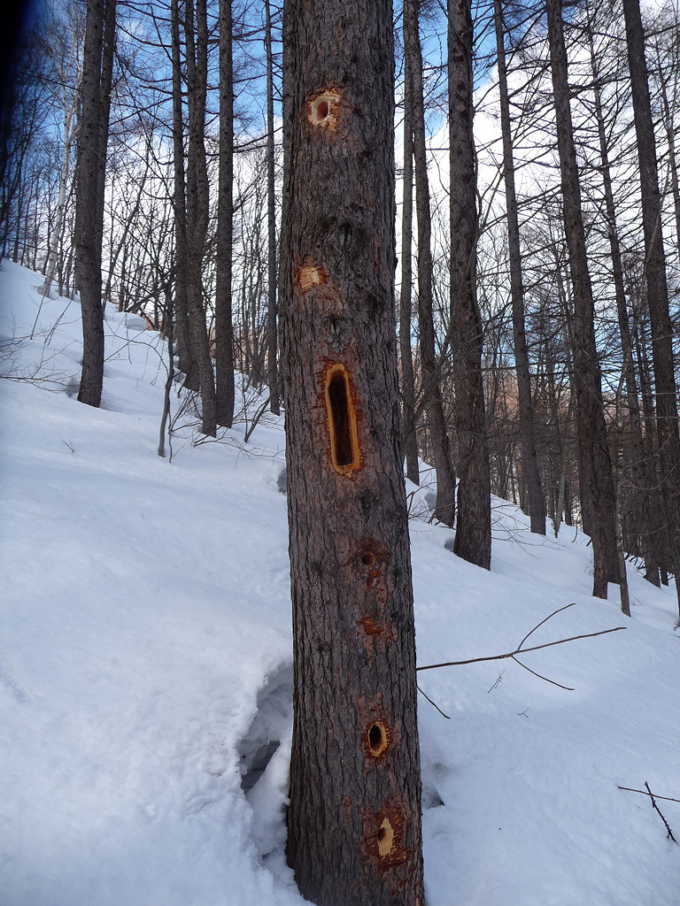 Winter is my favourite time to look for woodpeckers, not merely because in leafless trees they are more visibe, but because their sounds carry so well and so far. I recall once hearing a reverberating cannonade of blows in forest in the Akan National Park of east Hokkaido. In the frigid winter air that morning the blows carried far. Skiing closer, I located the bird high in a dead conifer. It was drumming hard on the rotten tree; sliding silently closer on my skis eventually I reached a position where I could rest my ear against the trunk. From far above me a rain of wood chips cascaded down and around me on the snow, while channelled down through the wood itself came the sound of that fusillade of blows. They sounded like the deep throbbing heartbeat of the dying wood.