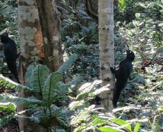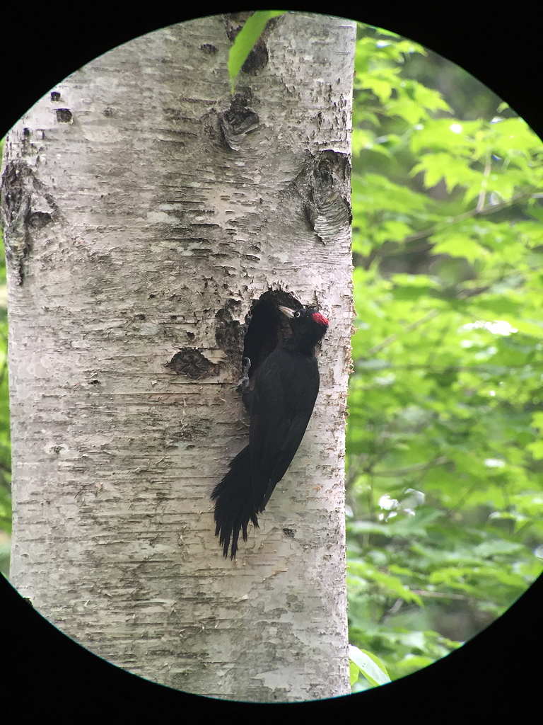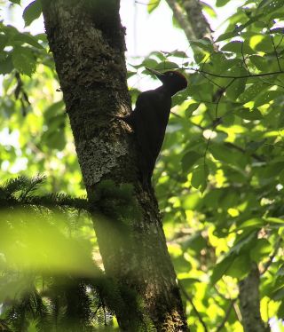 The Black Woodpecker of northern Japan is unusual in its predilection for foraging almost at ground level, low on large trunks and on fallen trees. Its loud “kree-ah, kree-ah, kree-ah” call given in flight carries far across the forest, giving away its presence, whereas other species tend to have abrupt sharp notes audible only at much closer range.