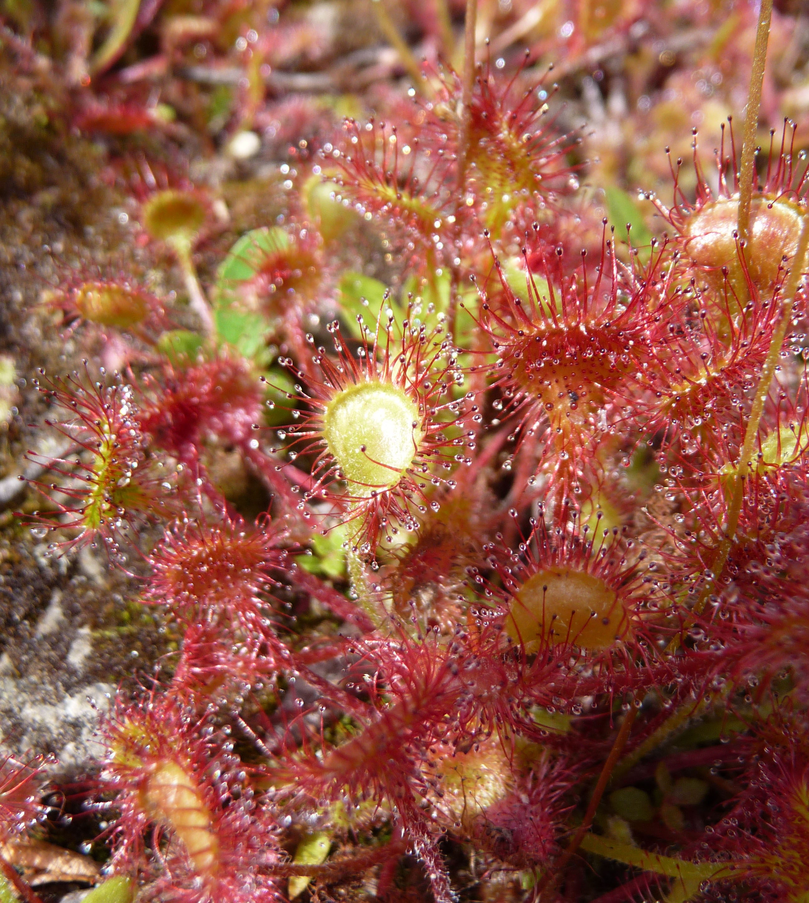 Sundews are easily overlooked. Small, ground-hugging and pallid, with the tiniest of white flowers atop a tall slender stem, there is not much to distinguish them. Sometimes they grow in sufficient densities for their slightly reddish tinge to draw attention to them. Then, on closer inspection, the ground may turn out to be dotted with them all glistening in a strange way. The glistening comes from droplets of sticky secretion around the fringes of their leaves, which, when triggered by a hapless insect that wanders on to a leaf, fold inward to allow the plant to digest the bug.