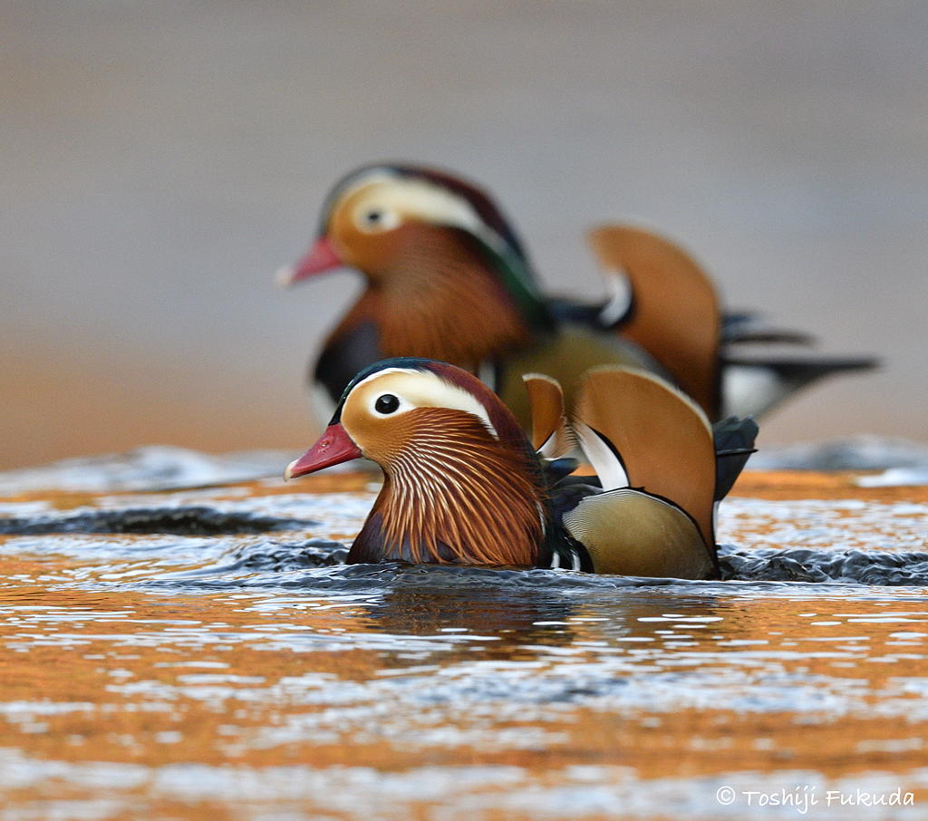 On the water, the Mandarin males swim leisurely back and forth, each holding its orange “sails” high above its back like a samurai’s pennant. Their capes and ruffs are spread for the greatest effect and they puff out their chests as they try to out do each other and at the same time attract the attention of the trim grey-plumed females nearby.