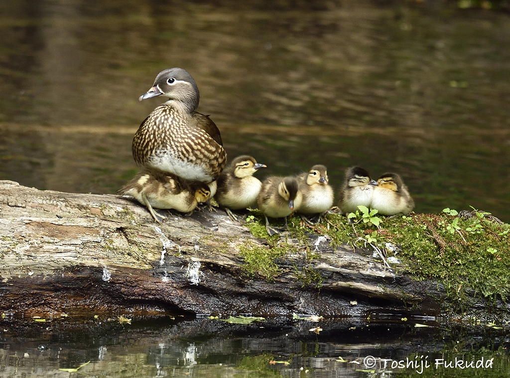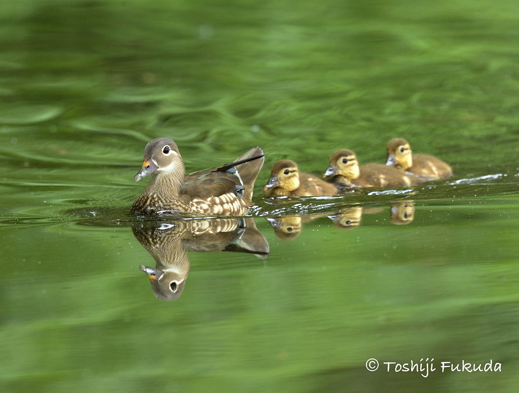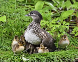 The tiny yellowish-brown chicks emerge as mere wisps of animated down, but soon they must learn the avian equivalent of base-jumping. Long before they have matured, their mother calls her chicks forth from the safety of their nest cavity, but there is only one way for them to leave it. They are clad only in their natal down and have yet to develop their feather coat so they completely lack the feathers they need for flight. So they must scrabble to the lip of their high-rise home, sometimes as much as 18 metres above the ground, then take the plunge and jump from the nest down to the woodland floor. Like tiny parachuting fluff-balls, legs and webs spread and tiny wings fluttering, they fall to bounce and land in the leaf litter far below. Then, they must make their way hurriedly to their mother and the safety of water, which may be more than a kilometre away from the nest tree. They rely on their own cryptic plumage, and her continually protective state of alert for their protection during the weeks during which they are growing. If startled or disturbed by a predator when very young they dive and flee to hide beneath the river bank, and when older they skitter and skim away across the water surface following their mother to safety. When young they are at risk from predatory fish, and mammals such as martens and tanuki (raccoon dogs), and as adults they are at risk from attack by forest-dwelling birds of prey.