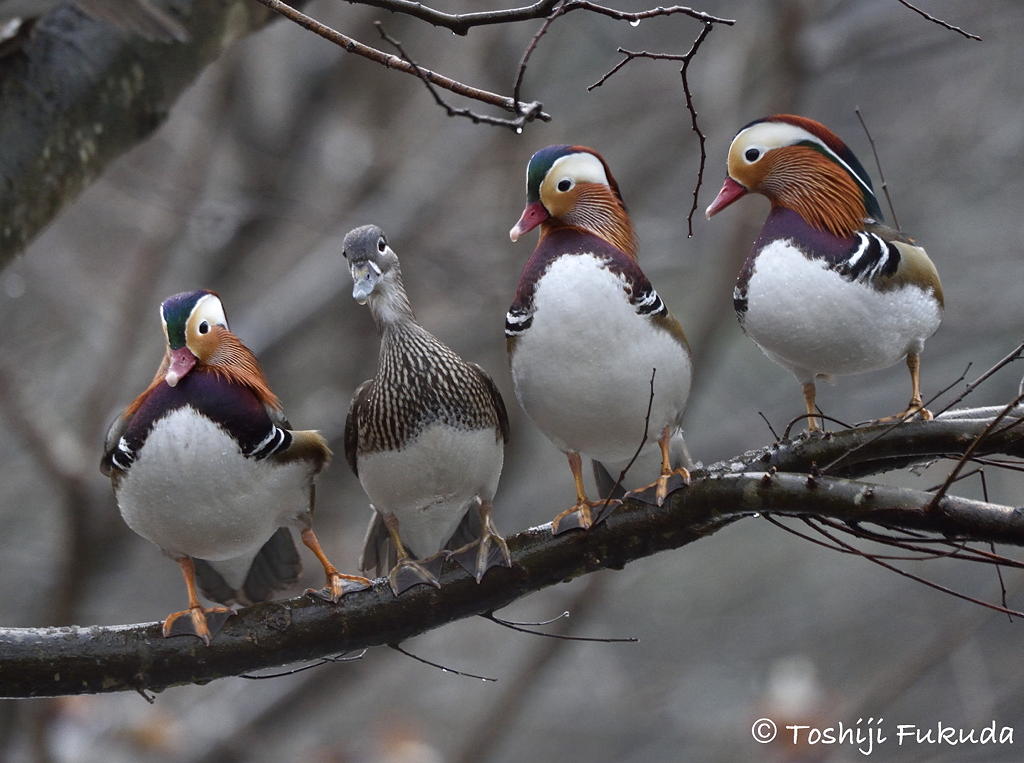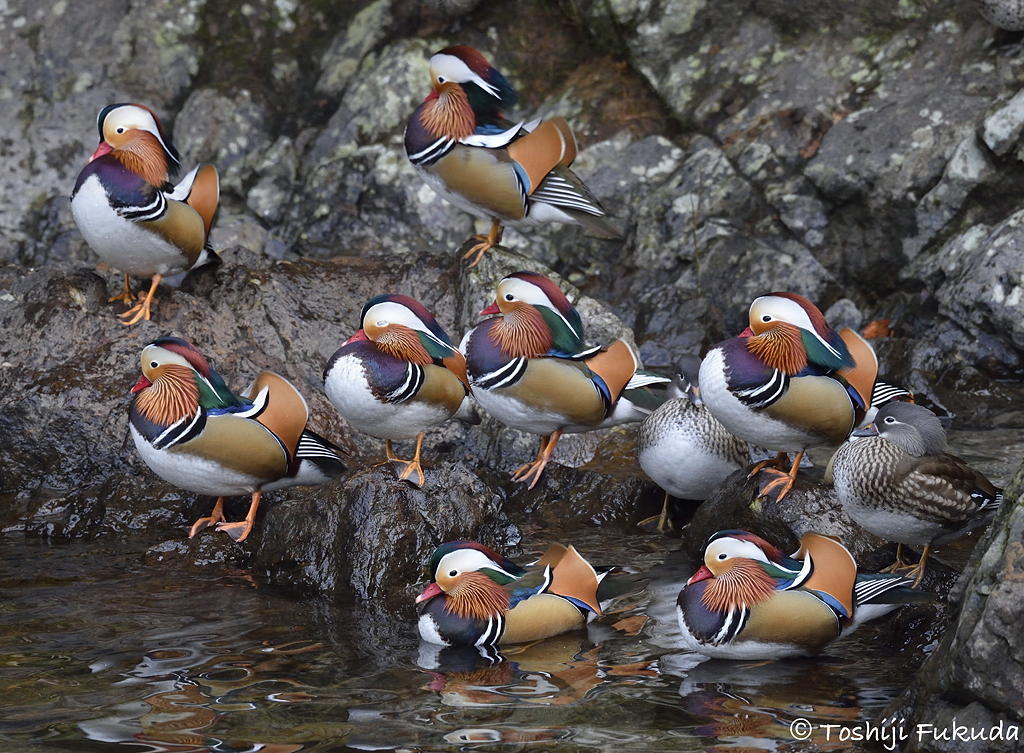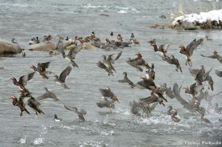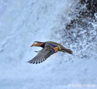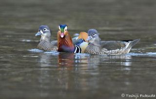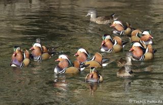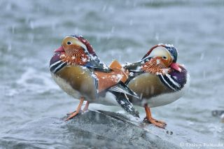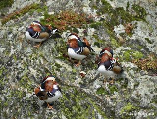 Then, Mandarins gather in increasingly conspicuous numbers at wooded lakes, even on moats and city park ponds in the lowlands of Japan. Even so, these wintering congregations are flighty, full of activity and prone to rising en masse forming a whirling airborne flock that flashes orange. It is during this season that the males busily posture before potential mates, whistling their intentions and showing off their finery. It is then too that avian predators such as the Northern Goshawk drive Mandarin flocks into the air and pick off their prey.