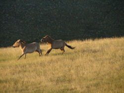 There, sunrise found me scanning valleys and hillsides in search of these beautiful wild horses. They look just as if they have stepped out of a prehistoric cave painting; stocky, pale- to mid-brown, white-faced, with a short erect mane and no forelock. In the dawn light I found a small group of mares with two young playful foals being watched over by their stallion, and in a valley a group of haremless males, and I was able to observe as their daily routine began. After spending the night in the valleys they move higher, following the sun to cooler daytime pastures, only descending again in the afternoon.