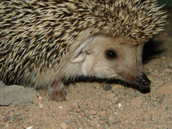 I have a fondness for hedgehogs that lingers from my childhood in England; but there, hedgehogs are rounded, somewhat porcine creatures (once known as hedge-pigs) that are apt to roll into a defensive tight ball bristling with spines when disturbed. The desert-dwelling long-eared hedgehog is an altogether more active, svelte creature, better endowed as its name implies, and far more likely to run than to roll. When I encountered another at dawn the following morning while I was out birdwatching, it immediately ran and pushed itself deeply into spiny vegetation — an admirable defense mechanism from predator and photographer alike.