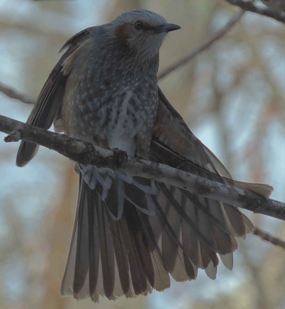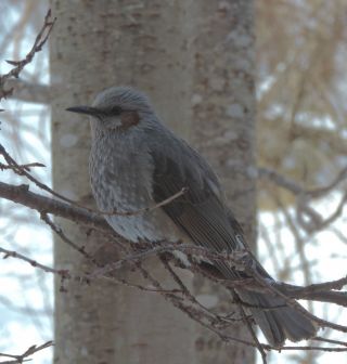 On cold winter mornings the bulbuls come squawking their full-throated calls as they swoop onto bird-feeders, their white-tipped gray breast feathers appearing frosted by the chill.There, they will eat bread crusts and seeds — or halved mikans given a chance — but in the forest they are omnivores. Superficially somewhat thrush-like, these birds that grow to about 28 cm in length have longer bills and tails than the average thrush — and they are much more conspicuous in the urban, suburban and rural environment than any of the thrushes found in Japan.