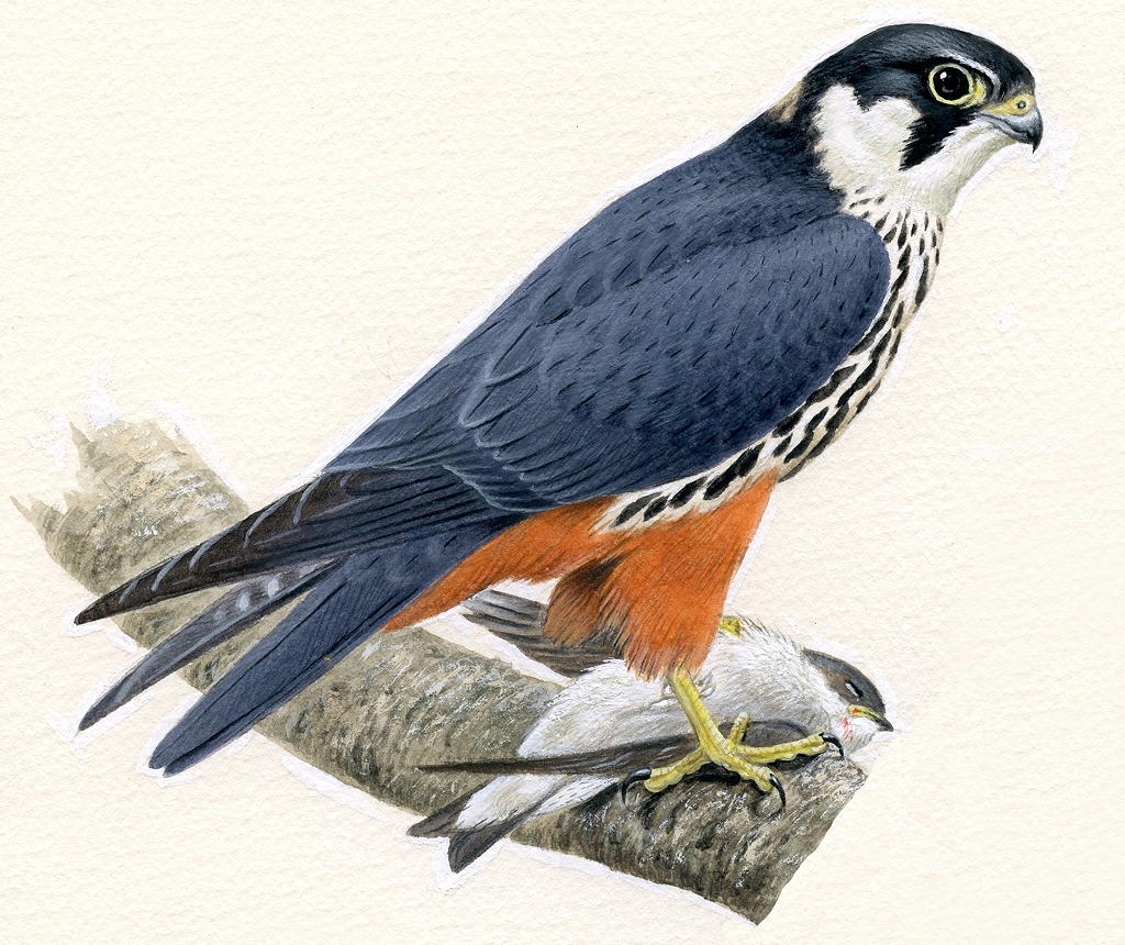 Fellow of the genus Falco, along with its bigger bird-bullying cousin the Peregrine, the Northern Hobby is an aerial master, capable of chasing down other supreme aerialists, even swallows and martins, themselves pursuers of aerial insects. When perched, an adult hobby has a bold and upright posture, appearing self-assured, a confident predator.