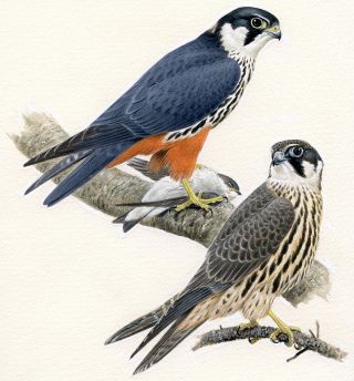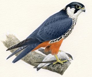 On rapid flickering beats of long scything wings, a Northern Hobby flashes past; its arced wings thrash the air with relentless power and its movements are accompanied by a hard chattering; no mercy there. The hobby shares, in the plumage of its upper parts the same sombre slate blue-grey of a miniature Peregrine Falcon, but in contrast to these funereal greys its white face combined with a bold mask and its strikingly streaked front set off by distinctive rufous thighs and undertail coverts lend it a lightness and elegance the Peregrine lacks.