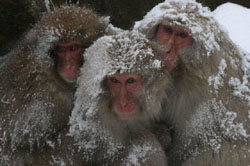 Suddenly, there were some of the creatures I sought — a group of five macaques were making their way single-file across the forest floor, their long, hairy gray-brown coats blending in beautifully with the dead leaves and wintry grasses of the forest. The only brightness about them was the shine in their eyes and the pinkness of their faces in the cold air.