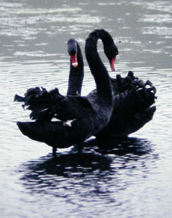 A pair of Black Swans get friendly in New Zealand, where they were introduced as 'ornamentals' from Australia, as they also have been to Japan.