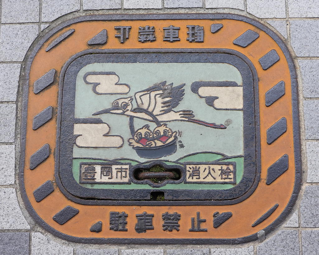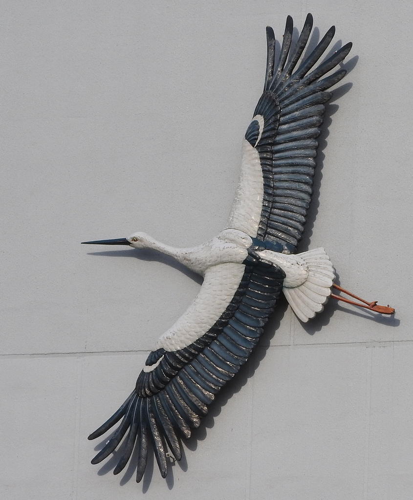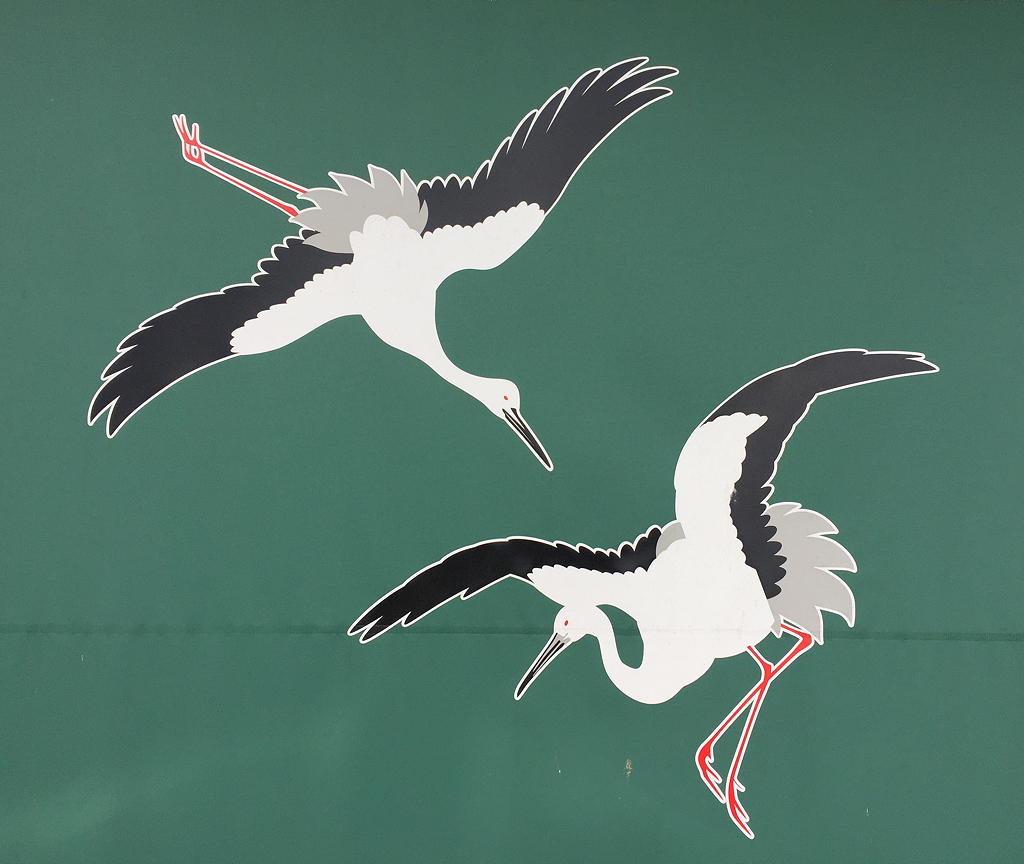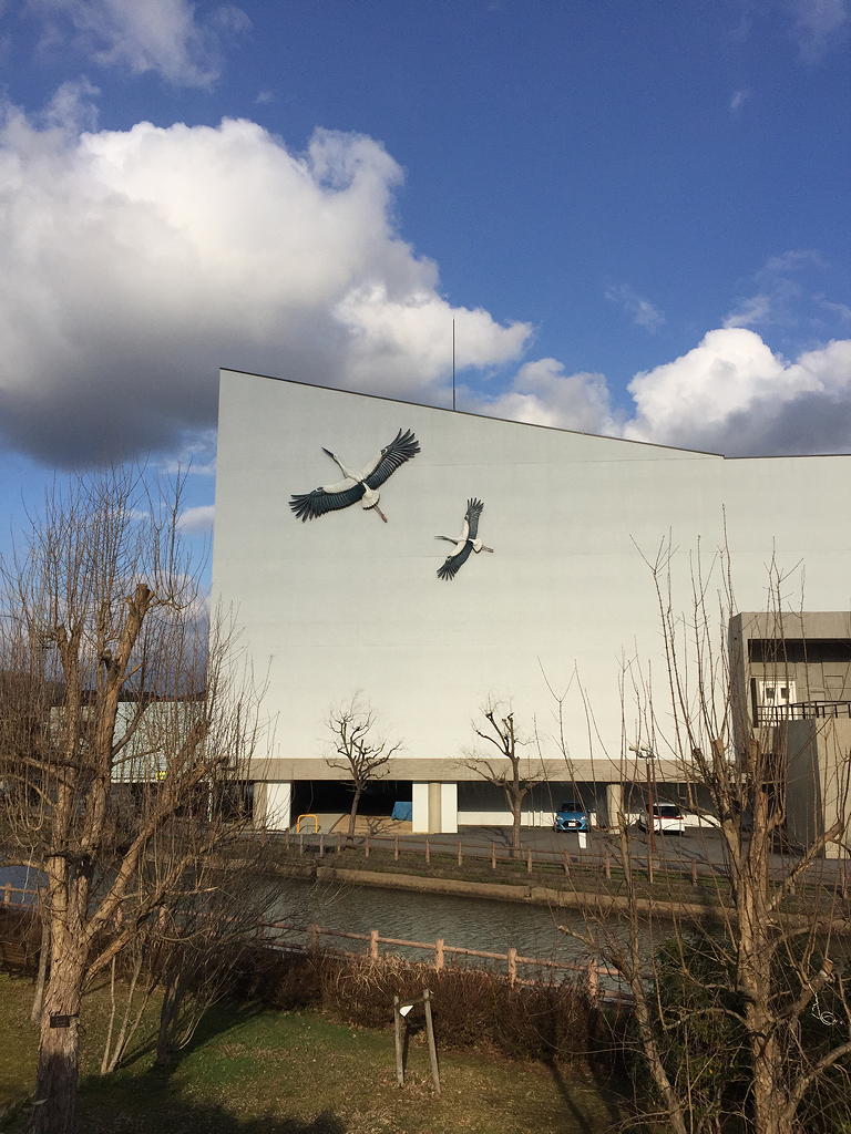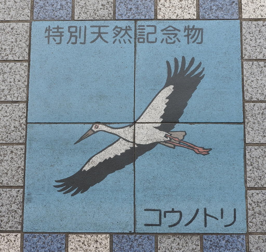 Hyogo Prefecture has truly taken this bird under its wing. Now the prefectural bird, the Oriental Stork greets visitors at so many turns. The gateway to stork conservation in Japan is Toyooka. If one flies in to the area, via the Tajima Konotori Airport no less, there is art there as a welcome, in the form of a stork reaching for the skies. If one drives into Toyooka, then it is hard to miss the Civic Hall (Shimin Kaikan) with storks flying across its façade, or the welcoming signs emblazoned with storks across the road. Among my favourites though are: the appearance of storks on the city’s colourful manhole covers (Japanese manhole cover art is an entire subject in itself, and not one really for Wild Watch); and the tiled depictions along one of the shopping streets. Stork art is just about everywhere in Toyooka, from edible souvenir packages of cookies, to shopping bags, shop fronts, coffee shops and even the streets in front of them.