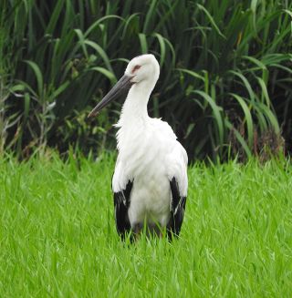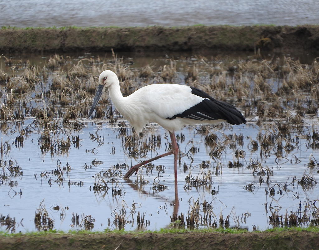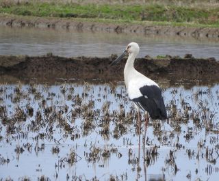 Researchers might consider that Oriental Storks are carnivorous and polyphagous, but to lay folk that means that they have an extremely varied diet and eat almost anything that moves or that wanders into their proximity. During spring storks gorge on frogs and fish in and around the rice fields, then as the weather warms and dragonflies emerge they take to snatching dragonflies from the air too. The storks consume native species and introduced species with abandon and are important predators of the introduced American Red Crayfish, which causes damage to the rice crops. During May and June, when rice planting has finished, the storks enjoy the bounty of abundant creatures in the wet fields. During their early summer nesting season they also consume snakes, small mammals, earthworms and even small turtles. As the rice crop grows ever taller the storks move away from the fields where they now find it difficult to locate prey and instead they forage along the banks between the rice fields and in the irrigation ditches and streams. As late summer begins to fade and the rice is being harvested the storks forage in and around the fields again. Now they feast on grasshoppers and locusts as long as they remain abundant, but take more snakes as the insect populations decline in autumn. Soon the hard times of winter return and the storks find it more and more difficult to locate prey. They prefer foraging in shallow water, which is why it is so important that rice fields remain flooded through the winter, or are flooded early well before the rice planting season. Like many large birds they may experience a seasonal pattern in weight, losing weight over winter, but regaining it again in spring. Ensuring that sufficient suitable habitat is available for them throughout the year is vital to their survival.