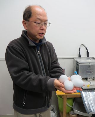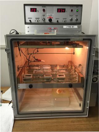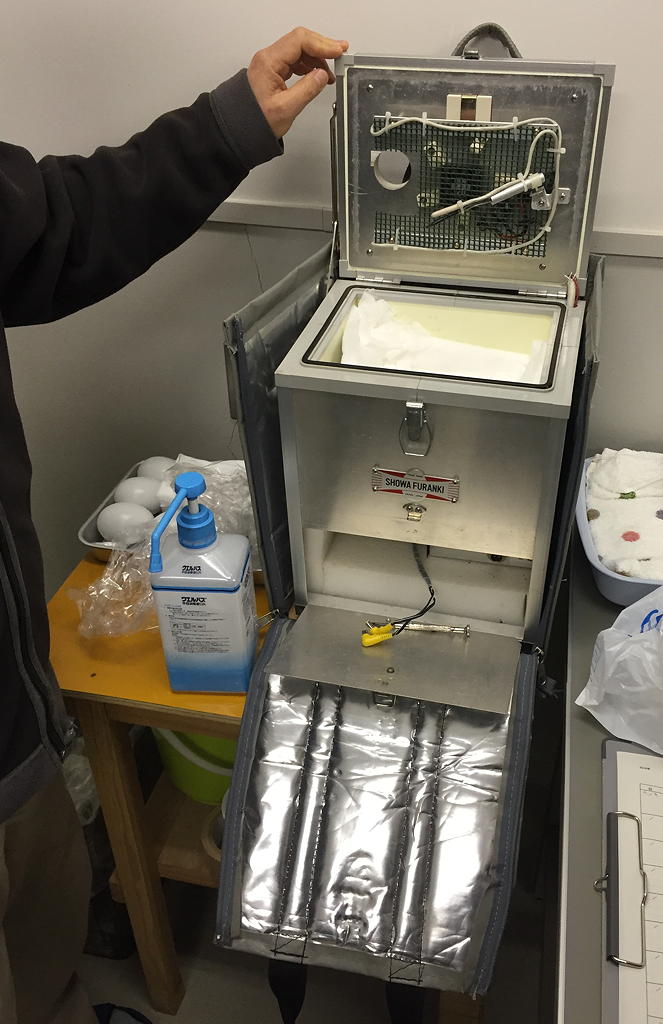 It is typical of young birds to wander in their first years, and entrenched in their genetic make-up is a migratory urge, so the wandering storks are becoming wonderful ambassadors to other prefectures, some of which also wish to participate in the restoration programme. As you can imagine, transporting live storks to other conservation and captive breeding facilities around the country is a very expensive business involving not only special secure transport, but also veterinary care and considerable paperwork to move a protected endangered species. Mr Minoru Funakoshi, a lively and dedicated staff member at Konotori no Sato kindly showed me the release box used for the very first release used by the crown prince, and the elegant solution to saving the expense of moving birds around the country. That solution was to scale down the in-house incubators that were being used to incubate stork eggs as the facility, and to develop a fully portable incubator that could be used to carry up to four eggs at a time. In this way it has been possible to support captive breeding in other parts of the country more quickly and, it is hoped this will ultimately lead to a more rapid spread and increase in the wild population. Perhaps soon storks flying over the rice field landscape of Japan will be commonplace once more.