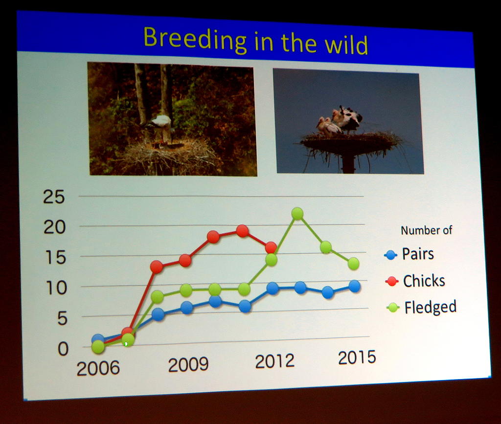 A key element in the success of the Oriental Stork conservation project has been involving the local agricultural community. It was the success of intensifying and modernizing farming during the 1950s and 1960s in order to increase yields so as to feed a growing population that led to the loss of diversity in the rice field wetlands, and it was that which contributed to the decline in the wild stork population. Having persuaded local farmers that there is now an added value to farming in a stork friendly way, conservationists in the area have had a chance to undo some of the detrimental aspects of previous decades.