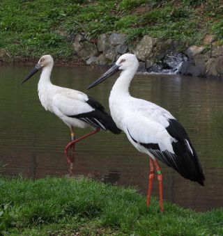 Amazingly, the Oriental Stork was once considered conspecific with the smaller, red-billed White Stork of Europe and Africa, though it differs in so many ways. The Oriental Stork stands an imposing 110–150 cm tall and is only marginally shorter than the stately Red-crowned Crane. The stork weighs 2.8–5.9 kg and has a wingspan of 2.22 m, again only slightly smaller than the 2.2-2.5 m span of the crane. It is easily distinguished from its more widespread western cousin, by a combination of factors, its size and black bill being the most obvious. At close range, the bare red skin surrounding the eye, and the white iris are two more key features, while when walking and in flight the Oriental Stork’s black and white “piano-key” wing pattern is dramatically distinctive.