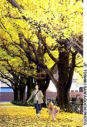 Although superficially similar in appearance to other trees, the ginkgo is biologically remote from all other plants. Deciduous and capable of growing to a height of almost 40 meters, it is a slender tree with light gray-brown, grooved bark. In spring, bright yellow-green leaves emerge, appearing alternately along twigs and branches, or sometimes in dense clusters from coppiced or trimmed branches. The leaves are quite leathery and become a richer, darker green in summer before turning a cheerful bright yellow in autumn. The leaves (which are the official symbol of the Tokyo Metropolitan Government) have prominent veins arising from the base that split repeatedly in two. It is the resemblance of this venation to that of the maidenhair fern that gives the tree its English name.