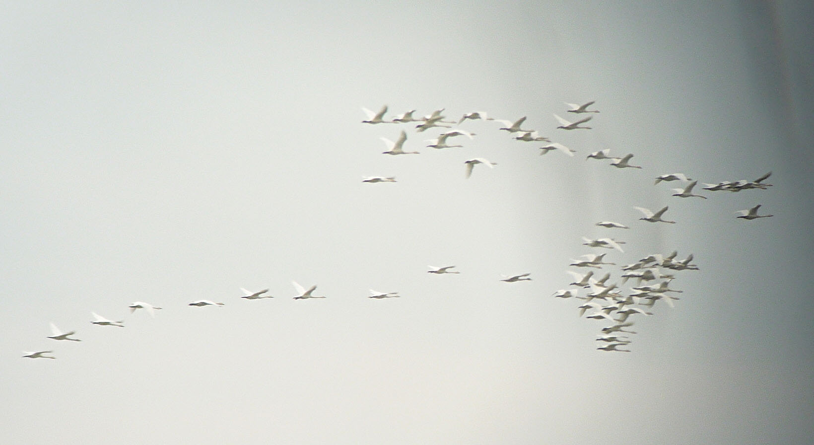 My ever-present binoculars resolve those lines. The flashing pristine whites and shadowy grays are distant flocks of migrating Bewick’s Swans whooping their way south. Their wings, whiter than fresh snow, catch the morning sun on their measured down beats, creating soft gray shadows on the up beats. The flock’s unsynchronized beats suggest a flickering motion, their undulating progress lends them an unhurried air, though their constant whooping — half social chatter, half bickering — reminds me of excited children on an outing.