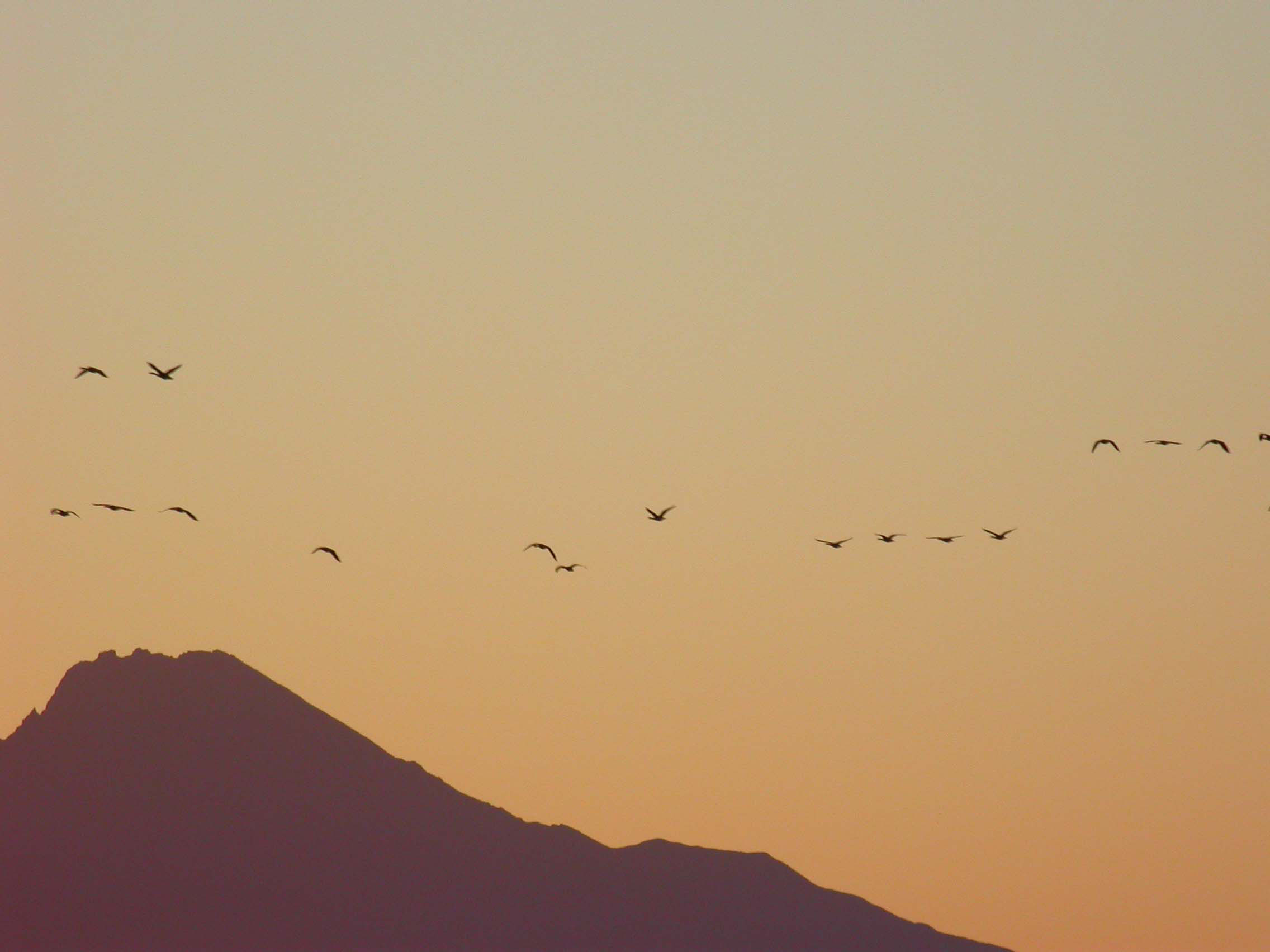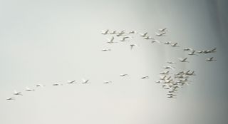 Small flocks and family parties of geese have been waking and leaving their roosting site since the dawn light was bright enough to fly by, but the eagle has spooked them and they now circle in their thousands in a panic.