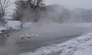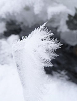 At one place, where the ice should have met the shore, rising warmth from a geothermal spring sent plumes of mist rising into the morning air. That mist, condensing on lakeside reeds and tree branches, had frozen in an intricate hoarfrost coating. Row upon row of tiny “ice-flowers” clung to the twigs; the slightest touch or breath of wind causing them to fall like icy imitations of plum blossoms felled by a spring wind.