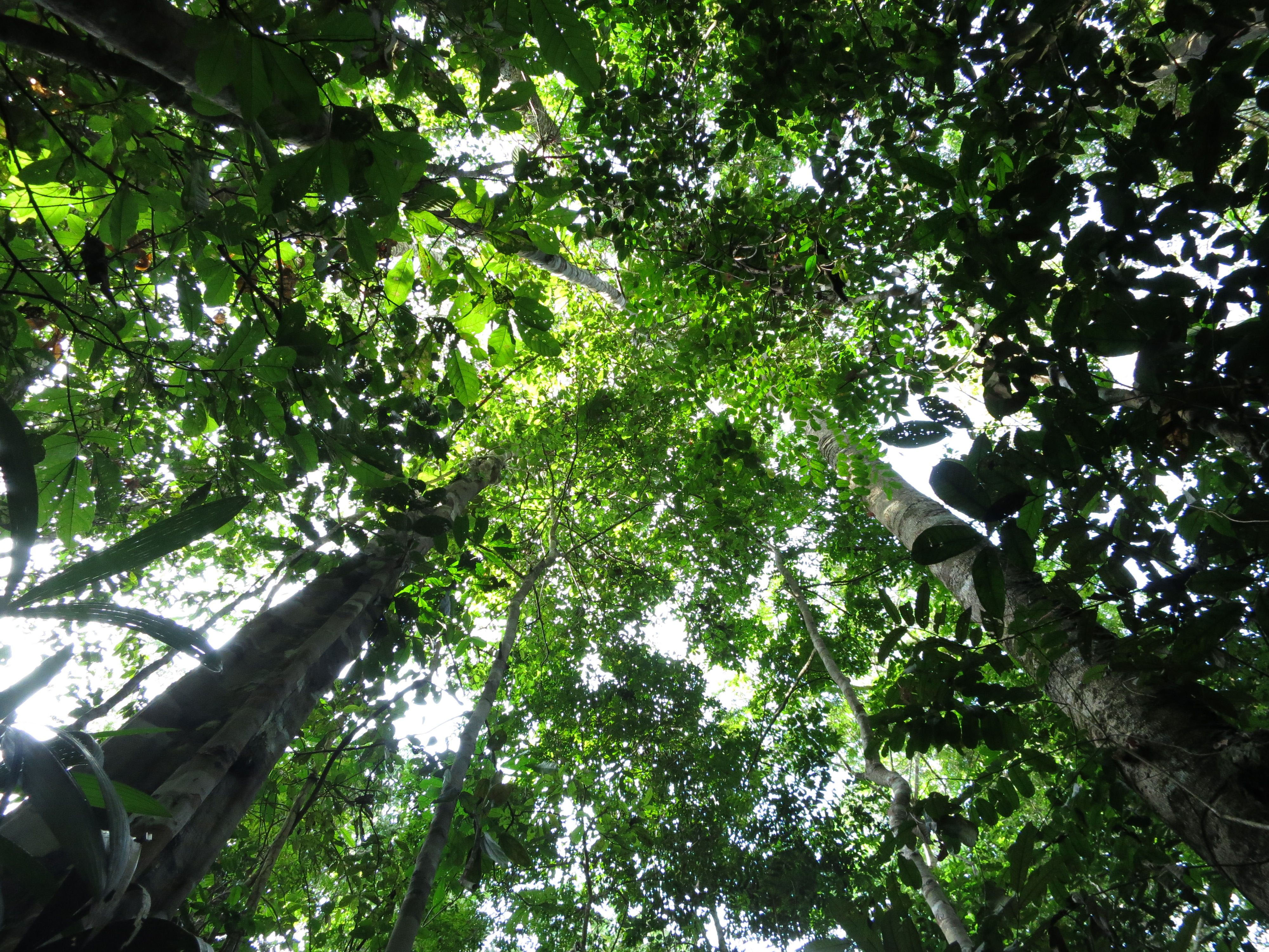 From below, the deep green of the canopy is shot through with idle rays of sunlight that pierce chinks and gaps in the mesh-mail of foliage above; the canopy seems like a vast ancient roof enclosed in stained glass of just one color but many shades.