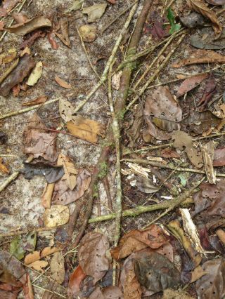 On the ground beneath those towering green cathedral-like pillars and arches there are, too, fallen leaves the length of my arm but wider; hand-size leaves all fringed and tapered, their elongated, sharp-pointed drip tips adept at shedding water in life, but now mere vestiges of net venation; and, of course, tiny leaves in uncountable numbers. Many of these browning, ground-covering fallen leaves show signs of past indignities — holes where crickets have grazed, crescentic cuts where leaf-cutter ants have foraged, pale tracks showing the traces of leaf-mining insects — and all under an accumulated load of fungus and lichen.