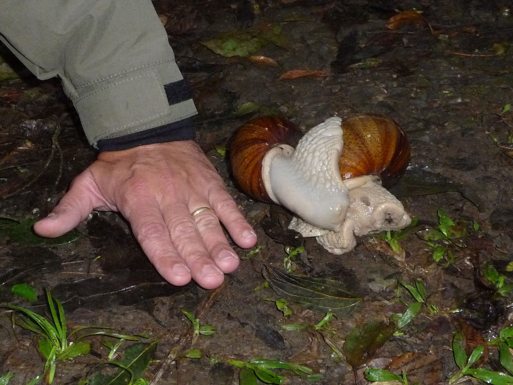 Gastropods also do very well in my friends’ garden ! Poring over the plants and walling of that damp corner, within just 15 minutes I recognized nine species of slugs and snails — more than the number of bird species I’d seen or heard that day. In fact, so absorbed was I in that gastropod menagerie that I didn’t notice the arrival of my biologist and conservationist friend, Ian Redmond OBE, until he called out to me.