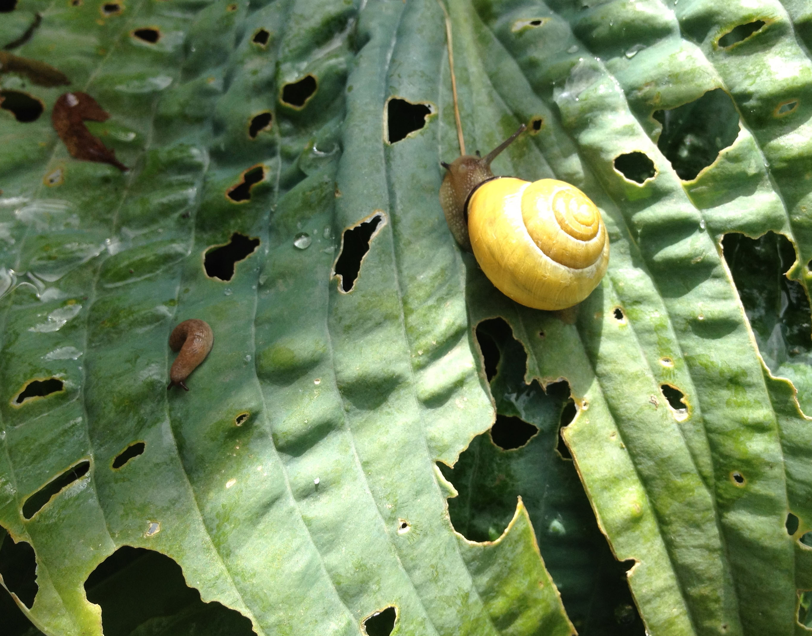 Late last month, I arrived at my friends’ house in the historic southwest English town of Stroud a little too early, only to find both Ian and Caroline Redmond out. So, with time on my hands, I wandered into their lovely garden on the slope of a hill overlooking the town and began to “potter about.”For some reason I was drawn to a damp corner, where I noticed a distinct change in the vegetation — it was all riddled with holes ! Every plant had been perforated until the leaves resembled Swiss cheese. I soon apprehended the culprits and realized I was in Gastropoda heaven — it was a slug fest and there were slugs and snails everywhere.