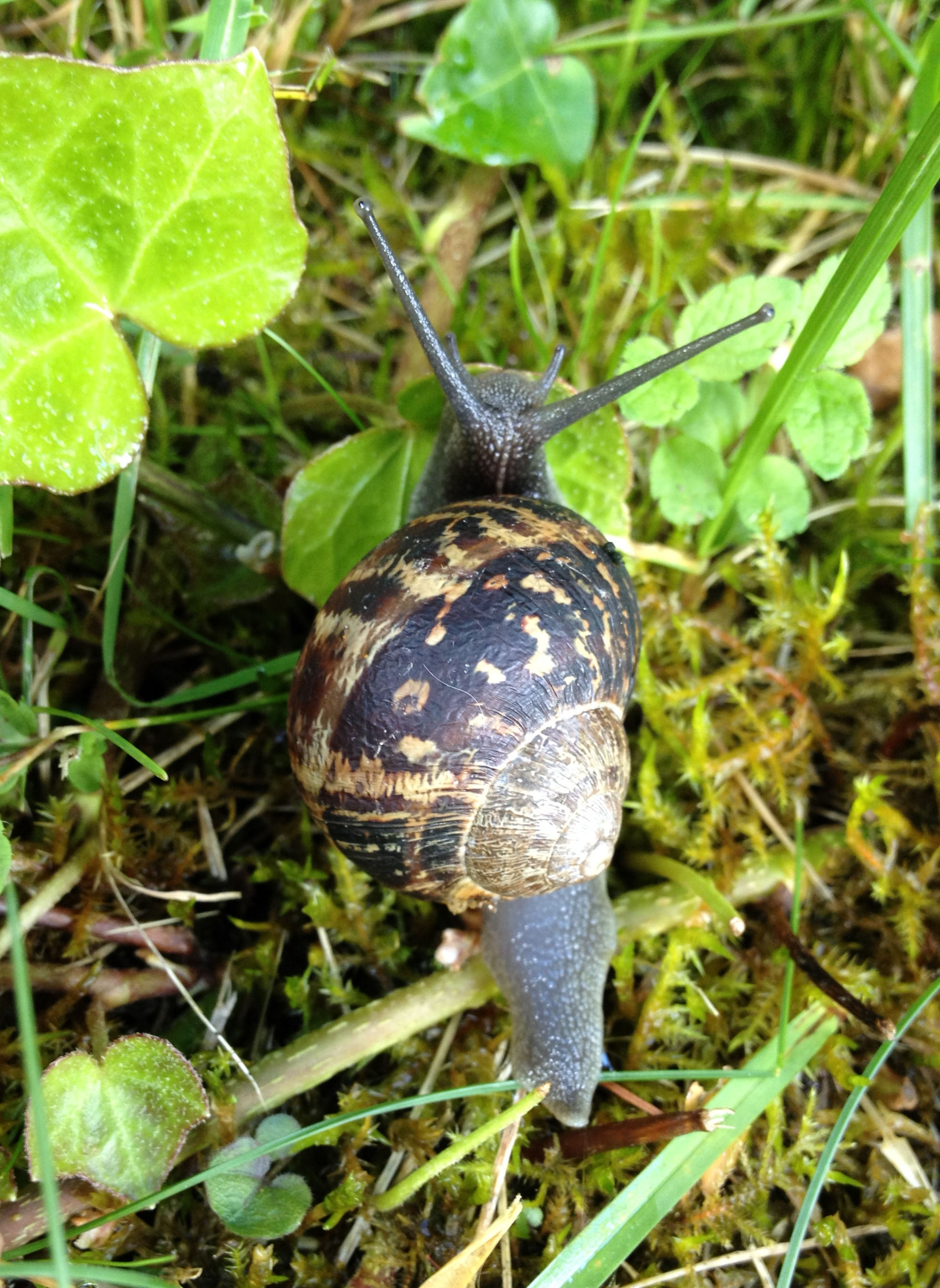 It is the fondness of many gastropod species for damp places that makes such corners in gardens so irresistible to them. As they move along, they wave their tentacles in front, sensing their environment and seeking food, but if you bend down and peer closely at one with a hand lens, or make a move to touch it, then those tentacles are as likely as not going to signal a retreat. First they shrink in upon themselves, then the whole creature retracts, and if it’s a snail it retreats back into its shell until it feels that disturbance is over.