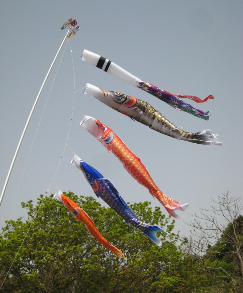 Fluttering flags in the shape of carp abound here in spring, in early celebration of the coming of May 5. Koi-nobori, known globally now as carp streamers, fill with wind and seem to swim in the air, setting off for success. Now Kodomo no Hi (Children’s Day) but previously Tango no Sekku (Boys’ Festival), one of the most popular national holidays, is celebrated in Japan by flying a carp streamer for each child (previously only for sons), a very large one for the eldest, the others ranging down in size, all hoisted on a tall bamboo pole crowned with a pair of spinning pinwheels. There can hardly be a more potent symbol for sending off one’s children into the wide world to achieve success through determination.