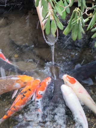 As I watched this parliament of fish, the individuals shifted and moved slowly. It was as if they were jousting and jostling in slow motion for a central position where each settled for a while with the miniature cascade pouring onto its head. As I watched them in their slow gyrations, I was reminded of the rotenburo (outdoor bath) from which I was just returning and how, with the pool being somewhat tepid that morning, I had taken refuge in the water beneath the inflow, huddling ever closer for its warmth. Were these fish doing the same? Later, when I investigated, I found that indeed the fish were warming their brains, by swimming beneath an inflow that was at a very comfortable 40 degrees Celsius!