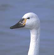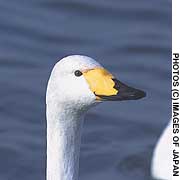 Unlike the Bewick’s swans with their highly variable bill patterns, the somewhat larger whooper swan, a common winter-visitor to Japan from Siberia, has a less noticeably variable bill. There are three basic easily recognizable types of bill patterning — the yellow nib, penny-face and darkie. But beyond these three, swan researchers find it difficult to distinguish whooper swans as individuals.