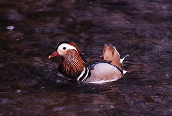 However, the most attractive birds here during winter are undoubtedly the Mandarin ducks. Drawn by the evergreen oak woodlands that provide plentiful acorns (a major food source for the ducks), and the shading, overhanging vegetation around the pond that allows them to roost in relative seclusion, these ducks are now a colorful winter fixture in the garden — the males flaunting gaudy orange whiskers and sail-like wing plumes, while the females are demurely dressed in mottled grays and browns. On cold winter days, they can be found lined along the shadiest sections of the pond bank, or perching on logs and branches. In summer, they retreat from the city to even more secluded riverside forests in the mountains of Honshu.