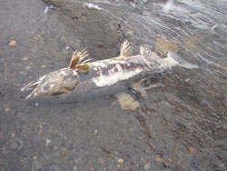 As I searched for that individual again by daylight, an apparent fish corpse lying at my feet startled me by suddenly bursting back to life. Its great tail thrashed, sending gouts of water splashing upward, its head rose up monstrously from the stream’s flow, as it gulped and gasped. A last nervous impulse, triggered perhaps by my shadow falling across its eye, had sparked this final burst of energy from almost entirely spent muscle.