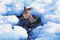 The moaning is now louder; a terrible heart-rending sound. A creature in dire distress, but surely not the deer. Now I can see the hind again. She is down; not shot, but stuck in the freezing water where she must have slipped off an ice floe. The small floating ice patches are not stable enough for her to climb out. Blood runs down her face. She turns her head mutely and I see her left ear has been bitten off — those damned dogs no doubt.