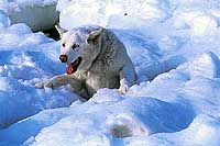 It’s the white dog whining — I see it now. Just a few meters from its victim, it’s struggling. It too is down — its hindquarters stuck deep in a crack in the ice, its rear half in icy water. It pants, its eyes wide, screaming. “Serves you right,” I want to tell it. The erstwhile predator squeals and whines like a frightened child; the former prey now still, eyes staring, quiet; in shock. Her struggles bring her to the brink of the hard ice, but each time she slips back into cold, deep water — more shock.