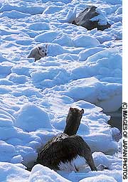 There will be a death here, perhaps two. No need to visit Africa to witness predator-and-prey struggles. Death is a drama wherever it occurs. Further out on the ice, 15 or so eagles wait. They perch on ice blocks pushed high by tide and currents. Around them wait a mixed flock of thick-billed crows and ravens. Are they already awaiting the inevitable death?