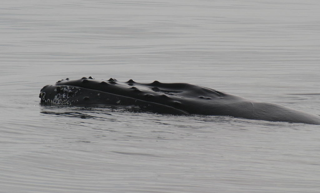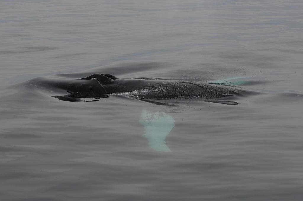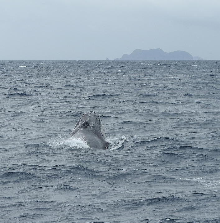 The ruffled surface of the sea and the overcast sky made it impossible for me to see down through the water, but nevertheless I peered and peered hoping to admire its long pale underwater “wings” and to spot the nodules and barnacle clusters along their leading edges, as I had once before when whale-watching off Newfoundland. It was not to be, but instead “our” whale suddenly lunged forward raising its head from the water as it did so and showing of the strange nodules atop its head then its massive paired nostrils and the wedge-shaped splashguard ahead of them. It exhaled once more then was gone. Wow! The excitement on board was amazing, there were grins all round, there were high fives, and whoops of delight. It was all in a day’s work for our captain.