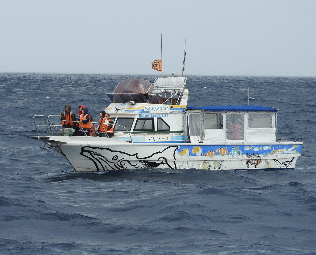 With fewer day-trippers arriving this morning off the ferry from Naha, we boarded the smaller Beagle III and set off once more this time for our fourth and final opportunity for whales. Once again we set off for the ever-popular northwestern area, but suddenly we slowwed down, turned and headed back then past the harbour leaving it behind us as we headed for the waters between the islands. The spotter above on Zamami clearly had fresh information.