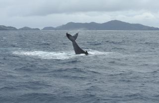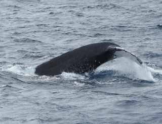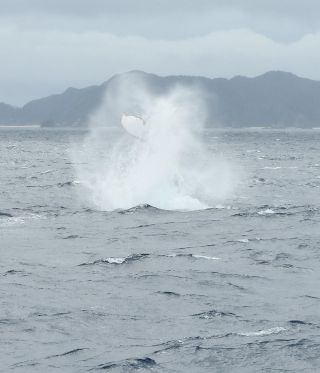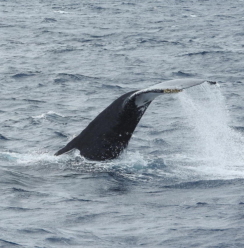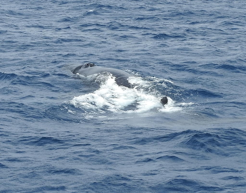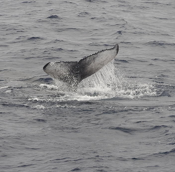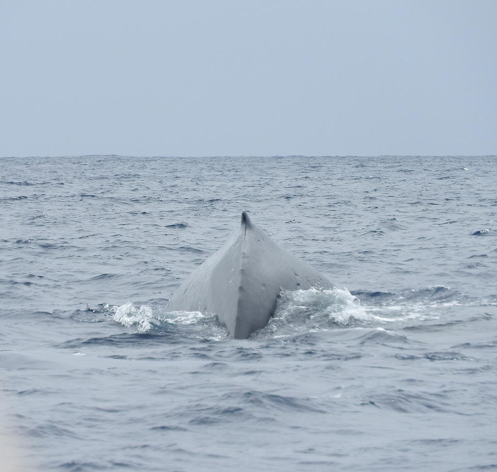 It was indeed Snoopy. Over and over again he not merely dove showing of his almost pure white flukes, but he lashed and thrashed at the water. Floating vertically with his head down deep he battered and bashed at the sea surface with the underside of his tail; each time it came down with a mighty crash. Then, as if to stretch out his back, he switched to battering with the upper surface of his tail, before lunging half out of the water and thrashing repeatedly not just with his flukes or tail base, but seemingly half of his body; the noise was incredible. It was an amazing show, my scepticism about the likelihood of finding whales was long gone, and it had been a red-letter day, furthermore it was only half done.