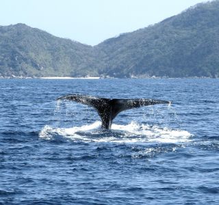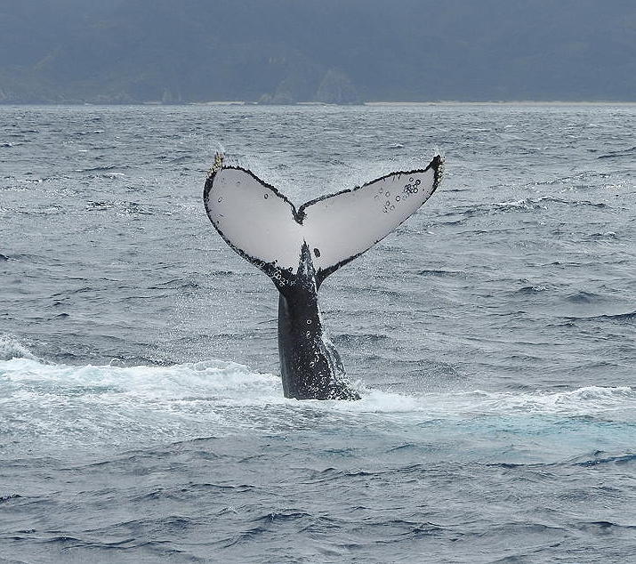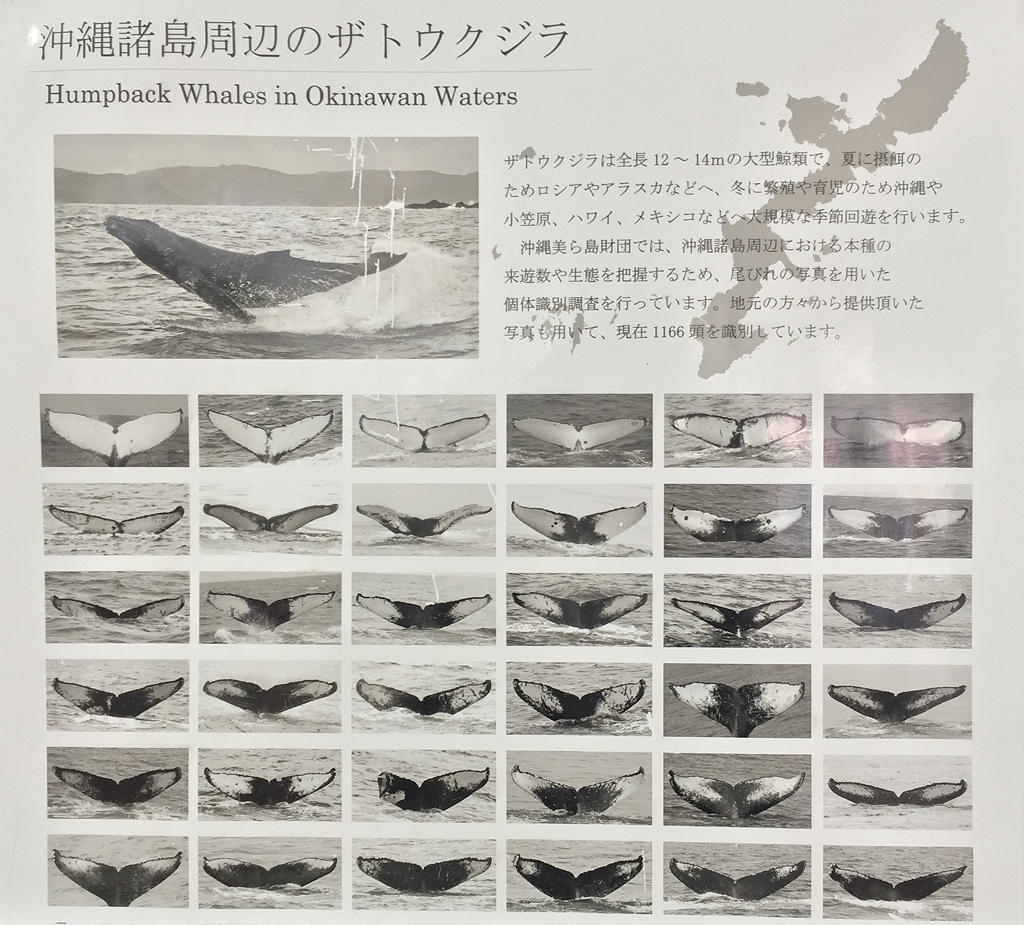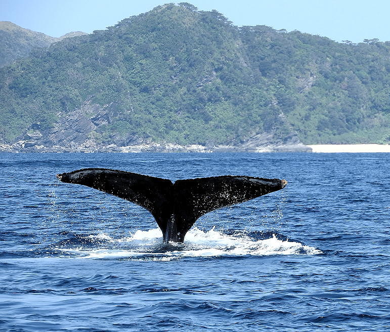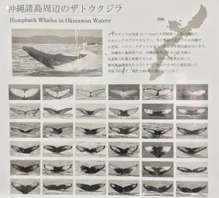 Dubbed by scientists Megaptera novaeangliae, the Humpback Whale is a long-distance migrant. The Kerama Islands, like the Ogasawara Islands, lie at the southerly extreme of a route that the whales follow annually between food rich summer feeding grounds in the cold waters of the Bering Sea beyond the Aleutian Islands and their calving grounds in the warm subtropical waters around Japan’s southern island groups. Each year the same individuals plough the whale-way northwards in the spring from early April onwards, the females then accompanied by their rapidly growing offspring, and southwards in the autumn returning to the islands in late December to give birth once more. How do we know? Those fluke patterns tell much of the story.