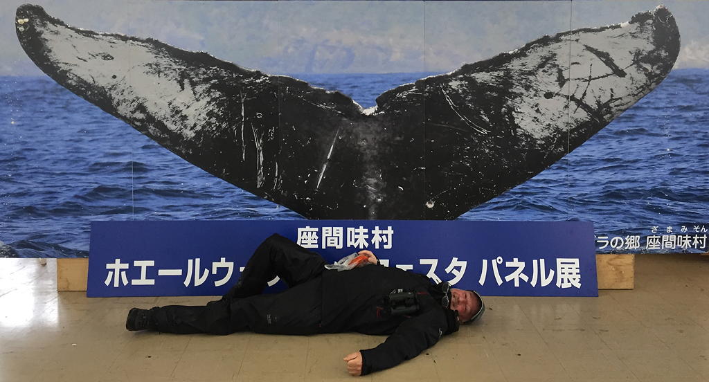 Pointing initially at the white taped outline of a whale on the floor in front of us, Otsubo-san generated a group gasp at the realisation that it marked out only the shape and size of a one-ton baby! It was the very much larger blue taped outline spreading across much of the enormous room’s floor that indicated the full size and shape of a 30~40-ton mother. Nearby stood a life-size photograph of a humpback’s flukes showing their four to five metre span. Immediately we had a sense of perspective. We were going out looking for a monster of a mammal.