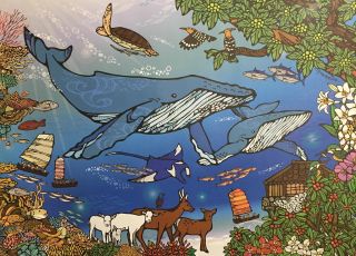 Someone more than capable of enlivening the scene is the Okinawan artist “Pokke104” whose depictions of the islands and their wildlife are beyond charming. We encountered her works in the tourist information office and gift shop and in a poster advertising an annual whale watching festival. But my goodness, if she was a Banksy the town could sport some amazing wall art in her vibrant colours and distinctive style.