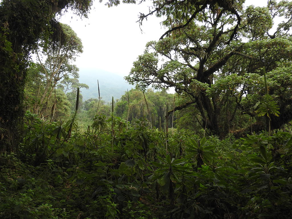 Gathering at the park headquarters early one morning in early September, Mayumi, my group, and I were assigned to visit the Isabukuru group. Soon afterwards our hike began. The trail took us between potato and pyrethrum fields as we ascended the volcanic slope towards the park boundary. The park is an island of volcanoes and forest habitat surrounded by a sea of agriculture. The very boundary of the park itself is a dry-stone wall over which porters helped us scramble. Stepping down on the inner side of that wall I felt as if I had passed through the wardrobe from this world into CS Lewis’s magical world of Narnia (read The Lion the Witch and the Wardrobe if you haven’t already!) the contrast was so extreme. Suddenly we were in a magical forest with enormously spreading Hagenia trees above us, their thick, wide-spreading branches were draped with epiphytic ferns and mosses, and the ground cover around us included giant dock and giant nettle, semi-familiar species that I knew featured in the gorilla diet.
