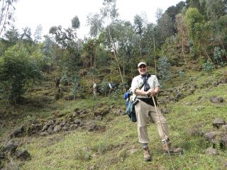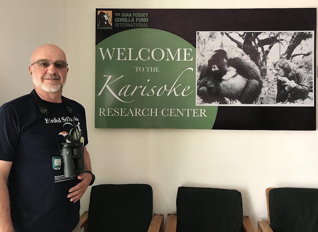 Ian was even more present at the new Dian Fossey Karisoke Visitor Centre. There I was led by the director, Felix Ndagijimana, to a diorama of Dian’s field study desk showing what it had been like back when she had just established her research base in Rwanda in the late 1960s. What should be displayed on that desk but some of Ian’s typescript notes! When I looked around after reading them I noticed a display of images taken by Dian, and there amongst them was one of Ian in his familiar field gear taken sometime in the 1970s sitting beside a family of gorillas. Ian’s many accolades include credits for both David Attenborough’s and Sigourney Weaver’s close encounters with gorillas in front of television and film cameras, and involvement in more than 50 documentaries on gorillas. In a very small way they also include inspiring me, through several decades of my life, to long to visit Rwanda and the mountain gorillas.
