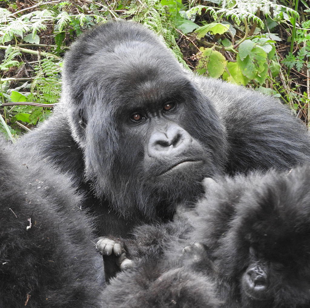 After a mere two and a half hours of moderate hiking we came into a small clearing and there met the all-important tracking team clad in uniforms bearing the logo of the Dian Fossey Gorilla Fund International. Responsible for tracking, monitoring and protecting the various groups of mountain gorilla in Rwanda that have been habituated to visitors, it is these folk who put their lives on the line in the battle against poachers. On that particular September day though they led us just a further hundred metres into the forest; then, as we turned yet another corner in the trail, we suddenly realised that we were amongst the Isabukuru family.