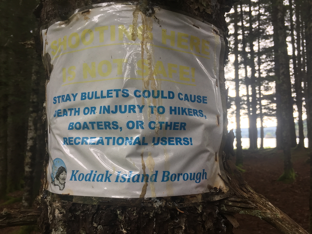 Being around large mammals in the wild is something one must always take seriously, but such mammals have their own agendas and they rarely bother people, in fact they are far more likely to avoid humans than to approach them (Polar Bears are the notable exception for they see everything as possible food!). Being around humans however is far more worrying. Give me wilderness over urban areas any time. My feelings of a strong preference for the security of being around large mammals over that of being around humans was borne out by my final sign sighted on Kodiak Island, Alaska.