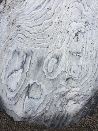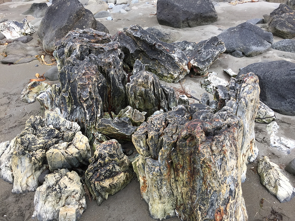 Fragments of petrified wood were much in evidence, lying along the back of the beach where they had eroded from the low cliff. Further chunks were protruding from the cliff, but the highlights were the standing tree stumps, one of which was still chest high. Overwhelmed in a lahar, a catastrophic volcanic event cascading an avalanche of ash, mud, and rocks, the trees became engulfed in a matrix of mud and angular, unsorted rocks. Rather than decomposing they were leached with silica (derived from the volcanic ash) and petrified into perfectly preserved solid replicas of their once living forms, complete with grain textures and knotholes.